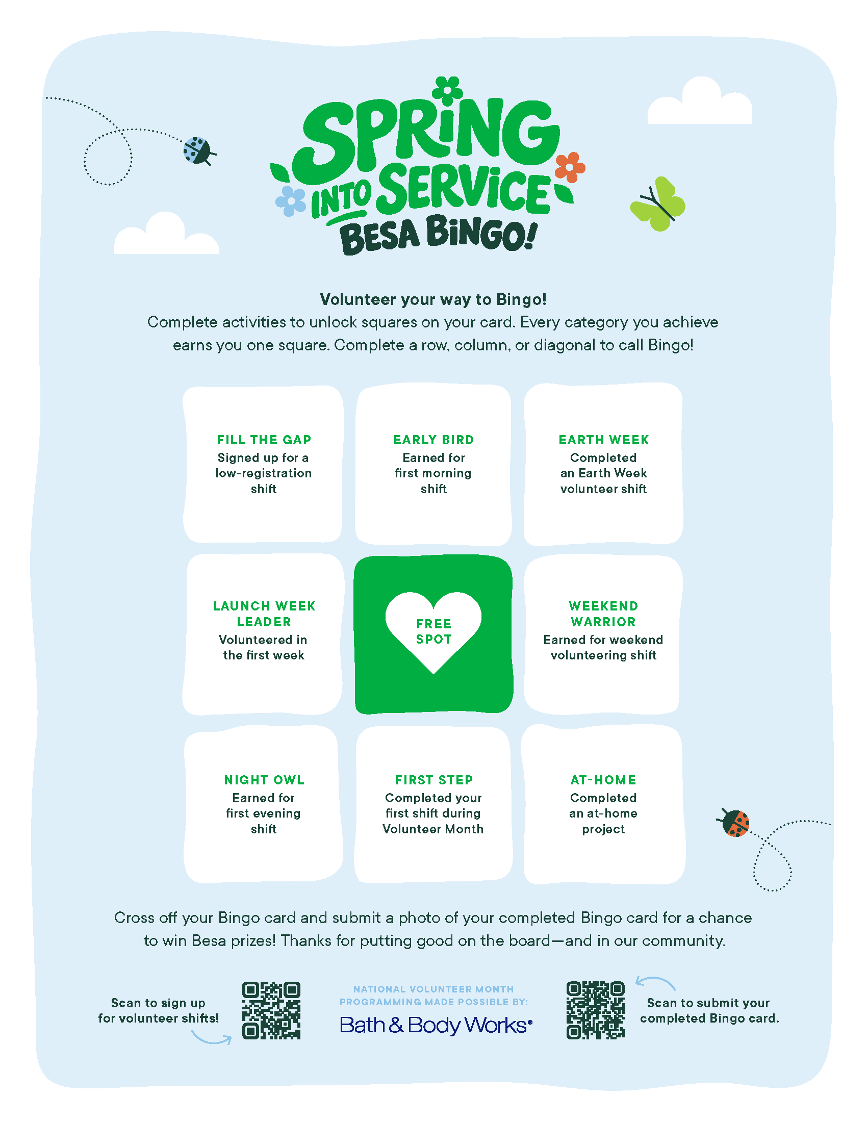 Cross off your Besa Bingo volunteer card within the month of April and submit a photo for a chance to win Besa prizes! Thanks for putting the good on the board – and in the community.